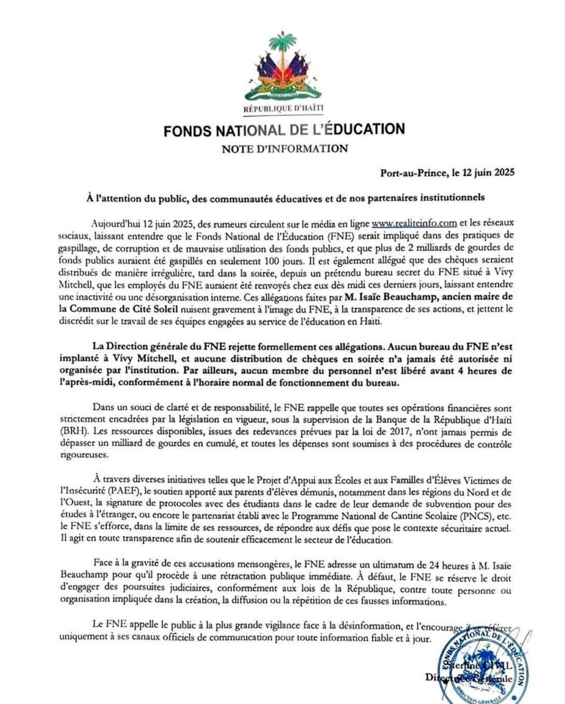 Dans une note d’information officielle adressée au public, la Direction générale du FNE dénonce des « accusations mensongères » qui portent atteinte à sa réputation. Parmi les auteurs de ces allégations figure Isaïe Beauchamp, ancien maire de la commune de Cité Soleil, qui affirme que plus de deux milliards de gourdes auraient été gaspillés en 100 jours et que des chèques auraient été distribués de manière irrégulière, tard dans la soirée, depuis un bureau secret à Vivy Mitchell.